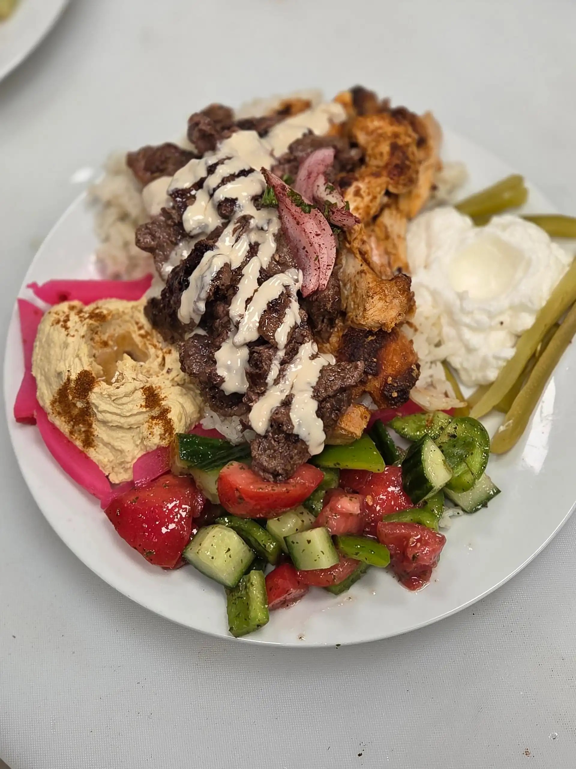 Chicken and Beef Shawarma, Lebanese salad, turnips, pickles, hummus, garlic & tahini sauce, & pita bread. Choice of rice (white & brown) or fries.